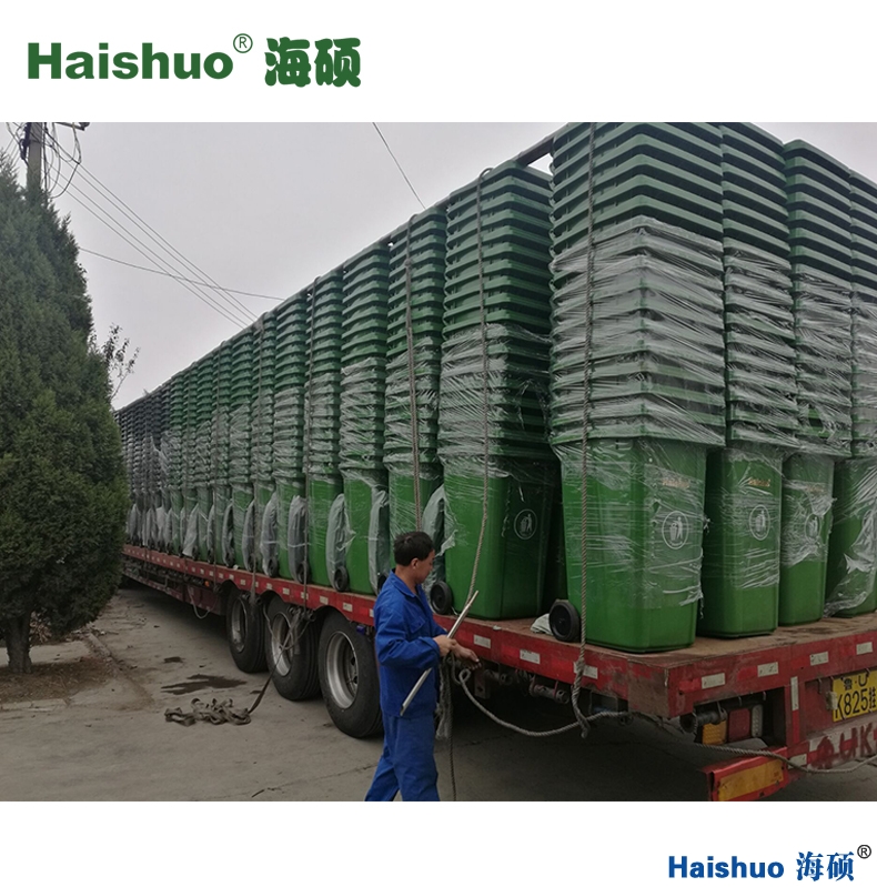 青島海碩 HS-120L-A-1環(huán)衛(wèi)垃圾桶,全面加強的桶身能夠配合汽車升降機,使掛車升降時不破損。