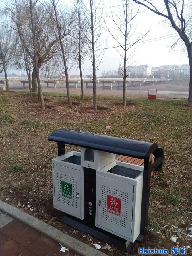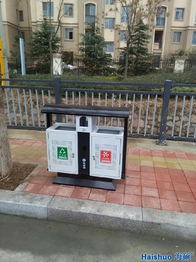 青島海碩戶外分類垃圾桶鍍鋅板HS-257,與普通垃圾桶比較而言,增加了桶身的強(qiáng)度,使之經(jīng)久耐用,并且美觀好看