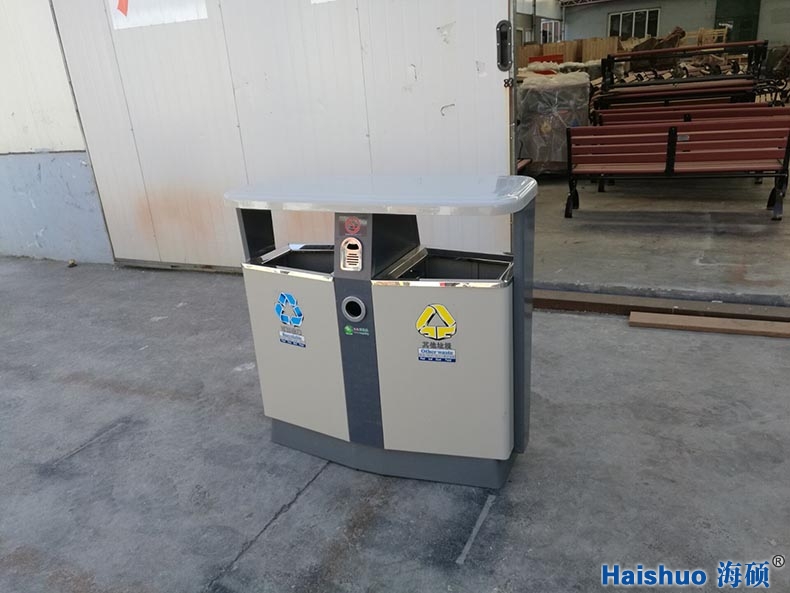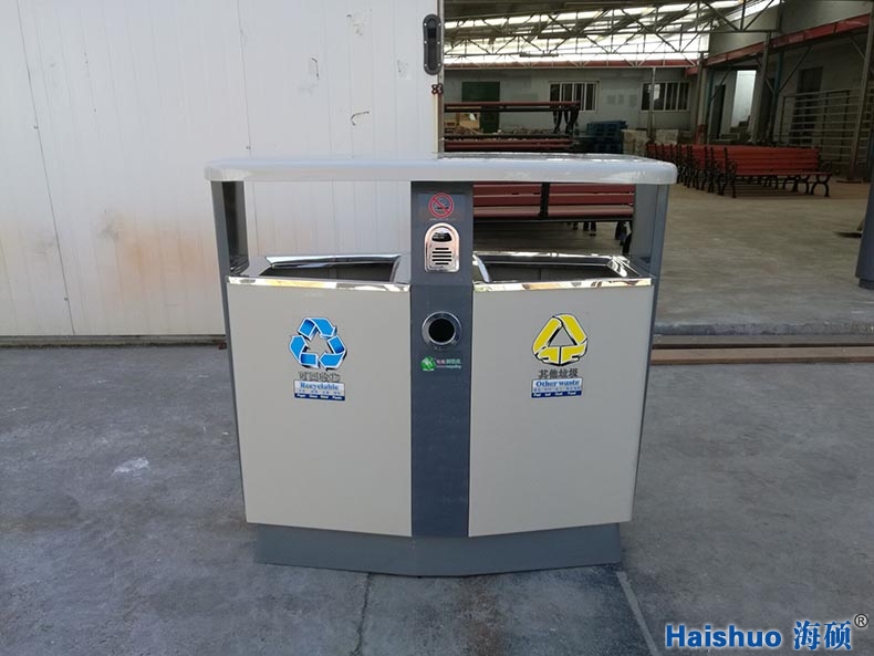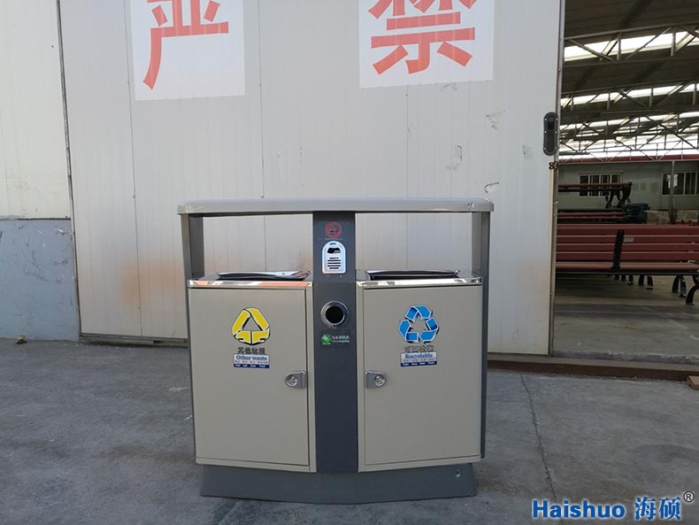 青島海碩戶外分類果皮箱HS-J-02,主箱體采用分解壓制成型的工藝,桶身面板處壓制加強(qiáng)筋,使外形更加穩(wěn)定;