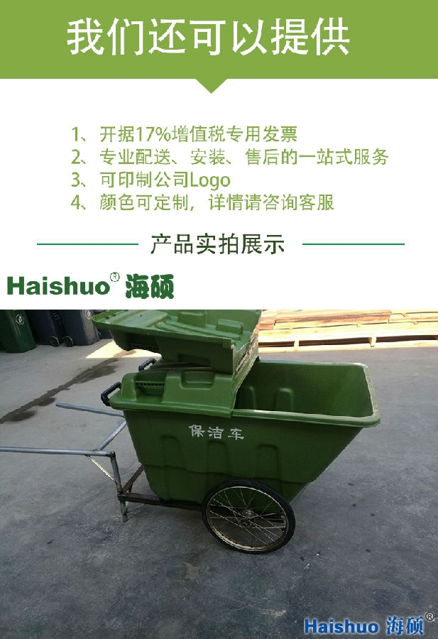 海碩HS-400L保潔車 詳細(xì)說明:海碩HS-400L保潔車采用全新高密度聚乙烯HDPE磨具壓制成型。1、桶身沿口加強(qiáng)筋的設(shè)計(jì)布局,使此款垃保潔車比普通保潔車承重能力更強(qiáng)大。2、海碩家的桶身前后承力部分有豎向加強(qiáng)筋,底部同樣加厚加強(qiáng)。3、本產(chǎn)品采用全新高密度聚乙烯,使保潔車耐老化,抗沖擊力有了更大的提升。