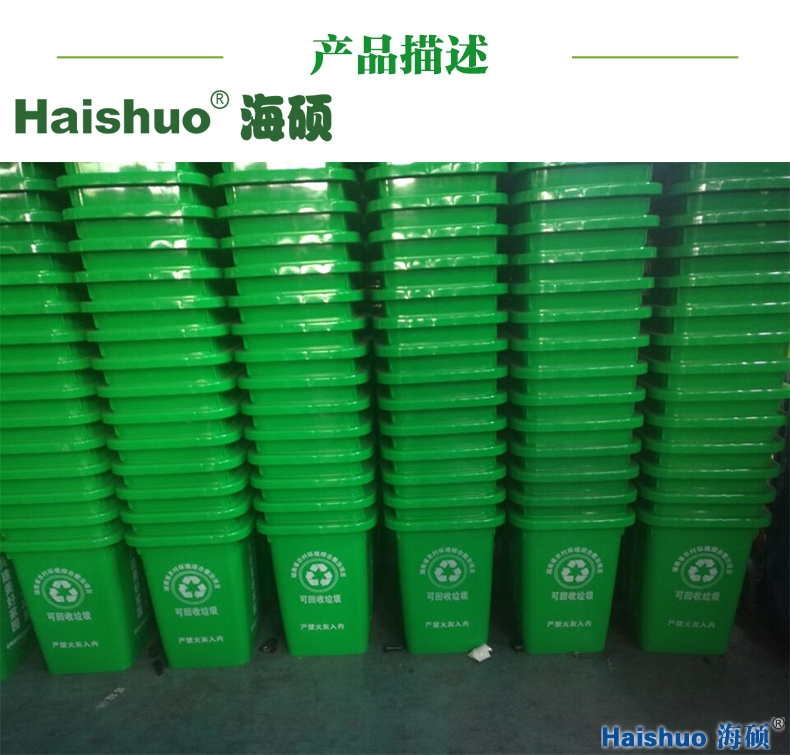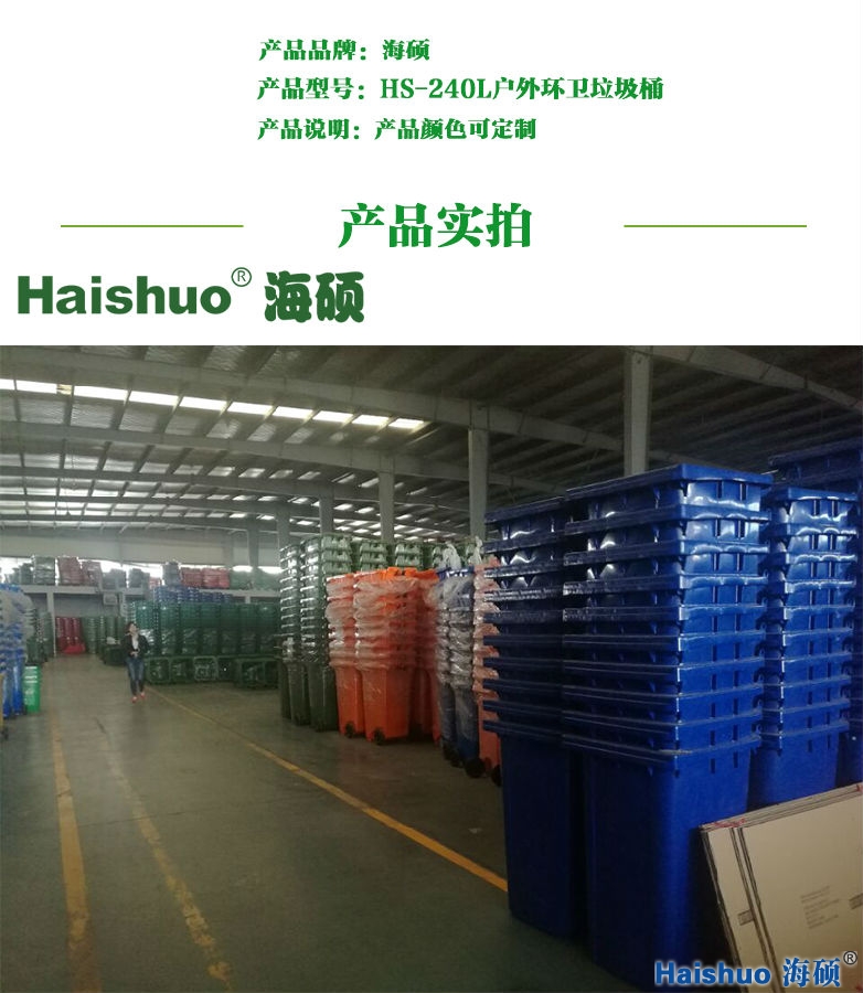 青島海碩HS-240L戶外環(huán)衛(wèi)垃圾桶 詳細說明:青島海碩HS-240L戶外環(huán)衛(wèi)垃圾桶,采用全新高密度聚乙烯HDPE磨具壓制成型,可與專用垃圾收集車配套使用。1、桶身沿口加強筋的設計布局,使此款垃圾桶比普通垃圾桶承重能力更強大。2、海碩家的桶身前后承力部分有豎向加強筋,底部同樣加厚加強。3、本產品采用全新高密度聚乙烯,使垃圾桶耐老化,抗沖擊力有了很大的提升。