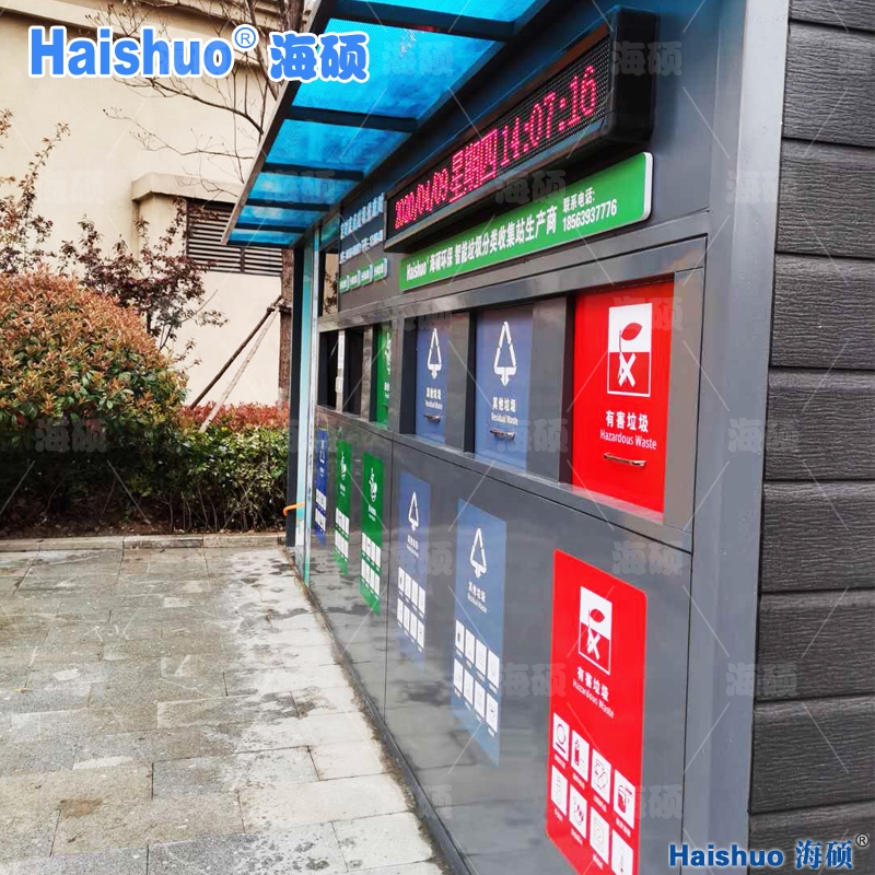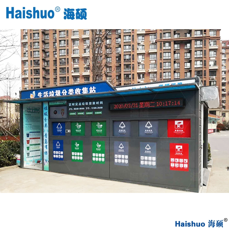 社區(qū)生活垃圾分類密閉收集站,具有垃圾桶稱重功能;線上APP積分兌換禮品功能;多媒體宣傳功能;同時該收集站設(shè)有清潔洗手配置,居民在垃圾投放后可以進(jìn)行手部清潔;該收集站還具備照明、監(jiān)控、殺菌、防蟲、防臭功能。