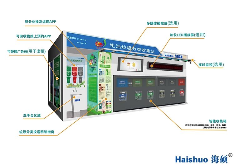 【主要功能】:垃圾稱重功能、線上APP積分兌換、多媒體宣傳服務(wù)、投放后洗手清潔、防雨、照明、監(jiān)控還具有殺菌、除蟲、除臭功能等。