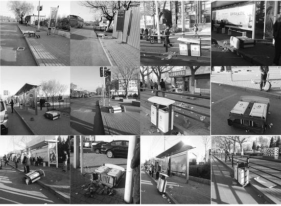 4月21日上午,街道辦事處工作人員在事發(fā)現(xiàn)場張前路、虹港路路段幾個公交車站看到,有4個垃圾箱被人推倒,歪斜地躺在草地上,地磚也被撬起。被推倒的垃圾箱有的已嚴(yán)重變形,有的雖從正面看完好無損,但后蓋已經(jīng)扭曲變形,人為破壞的跡象明顯。
