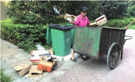 當(dāng)問及物業(yè)是否要求保潔人員對垃圾進行分類處理時,他表示并沒有這樣的要求,個別保潔分類也只是將可賣物挑出自行變賣!耙环矫媸且驗橛械木用癫]有做到垃圾分類,導(dǎo)致垃圾又混在了一起。另一方面是因為運送垃圾的垃圾車就是一個大空間,沒有分類空間。還有就是垃圾中轉(zhuǎn)站也沒有垃圾分類放置設(shè)備,所以就算分類運輸了,到垃圾站也還是要混合堆積的。”