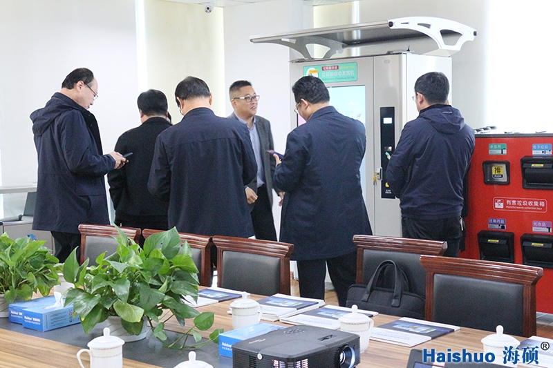 各位領(lǐng)導(dǎo)首先參觀了海碩環(huán)保垃圾分類展廳,了解了海碩環(huán)保目前主要的垃圾分類產(chǎn)品。同時,工作人員詳細(xì)介紹了智能垃圾分類設(shè)備的各項(xiàng)功能和使用方法,并現(xiàn)場進(jìn)行了操作演示。