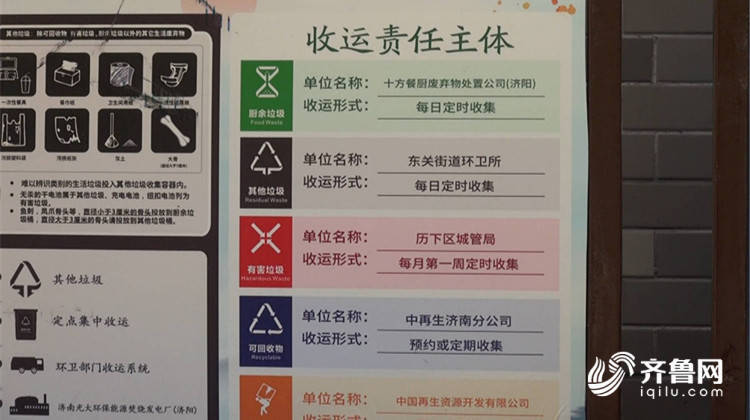 垃圾桶旁的標(biāo)識牌上,明確標(biāo)有分類垃圾的清運工作負(fù)責(zé)主體。據(jù)歷下區(qū)東關(guān)街道城管科垃圾分類工作負(fù)責(zé)人宋鵬介紹,“每個月第一個星期歷下區(qū)城管局會對有害垃圾進(jìn)行定時收集處理,廚余垃圾則是每日收集清運!