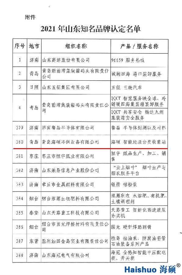 12月20日,山東省品牌建設(shè)促進(jìn)會(huì)發(fā)布《2021年山東知名品牌認(rèn)定名單》,青島海碩環(huán)保設(shè)備有限公司“海碩 智能垃圾分類(lèi)收集站”榜上有名。這不僅代表著社會(huì)各界對(duì)海碩品牌的充分認(rèn)可,更是對(duì)海碩智慧垃圾分類(lèi)產(chǎn)品及服務(wù)的肯定與鼓勵(lì)。對(duì)海碩環(huán)保而言,每一項(xiàng)榮譽(yù),都是不斷向上攀登中的嶄新起點(diǎn)。