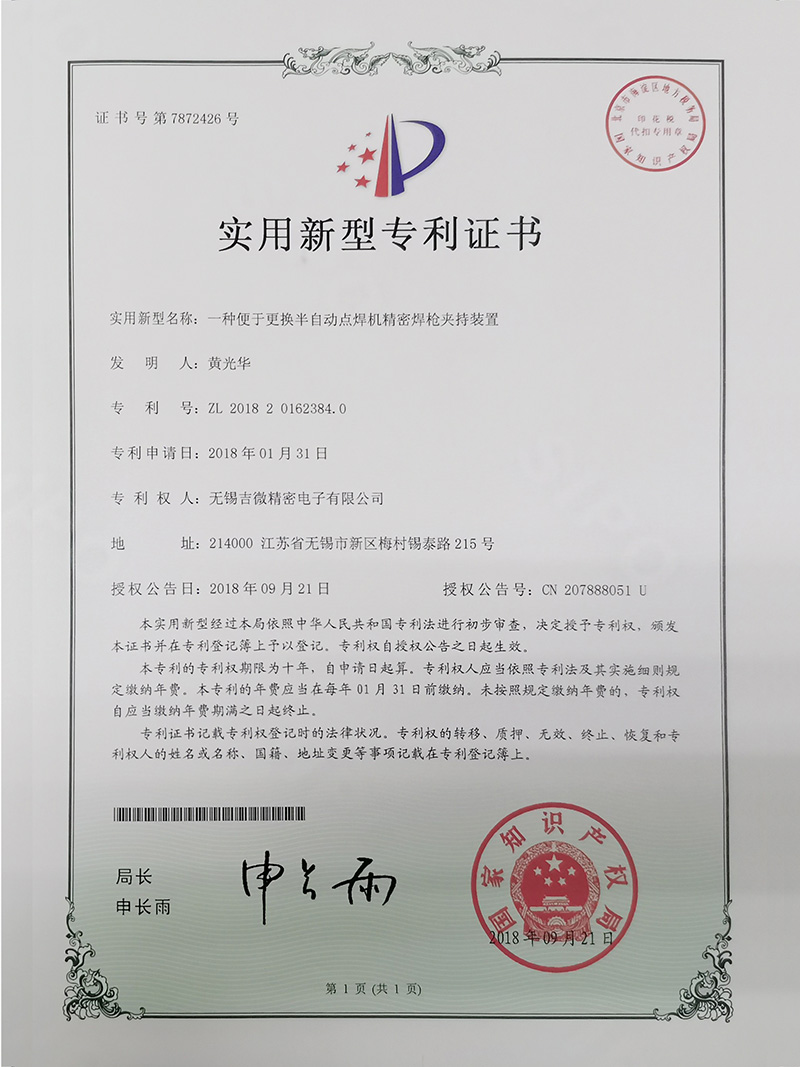 一種便于更換半自動(dòng)點(diǎn)焊機(jī)精密焊槍夾持裝置實(shí)用新型專利證書