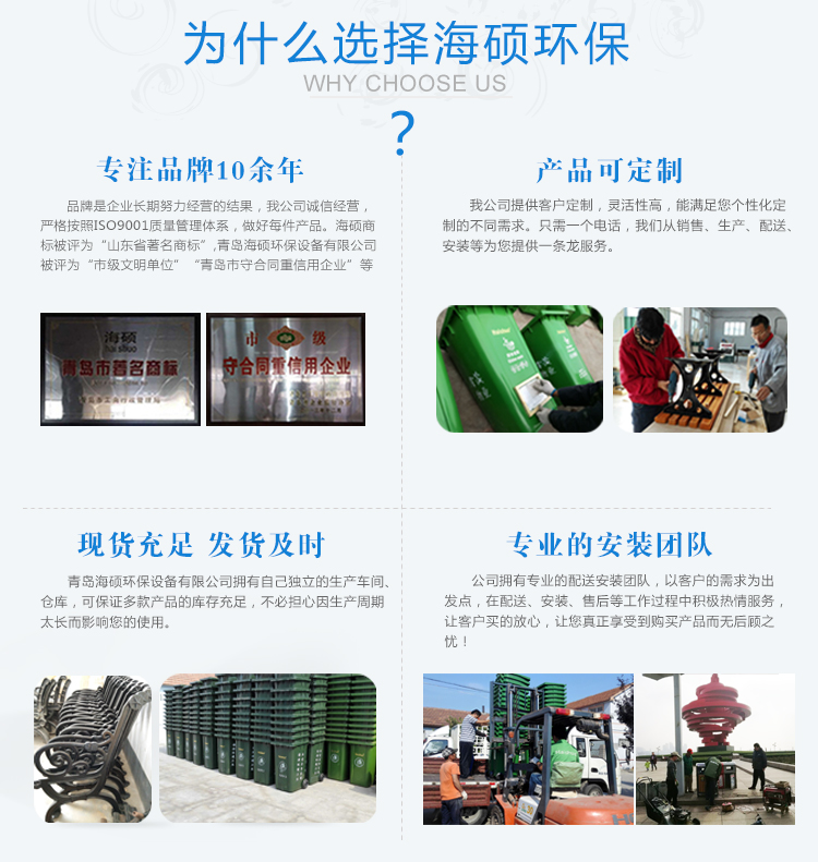 青島海碩環(huán)保設備有限公司成立于2005年,位于美麗的帆船之都—青島,海碩環(huán)保是主要從事垃圾容器、醫(yī)療廢物容器、公共設施、景觀設施的研發(fā)、生產(chǎn)、銷售的企業(yè),公司生產(chǎn)的產(chǎn)品主要用于垃圾收集、醫(yī)療固體廢棄物收集、公共設施配套等,在創(chuàng)建全國文明城市、衛(wèi)生城市、園林城市、城市垃圾分類、城鄉(xiāng)環(huán)衛(wèi)一體化等領域中廣泛應用。